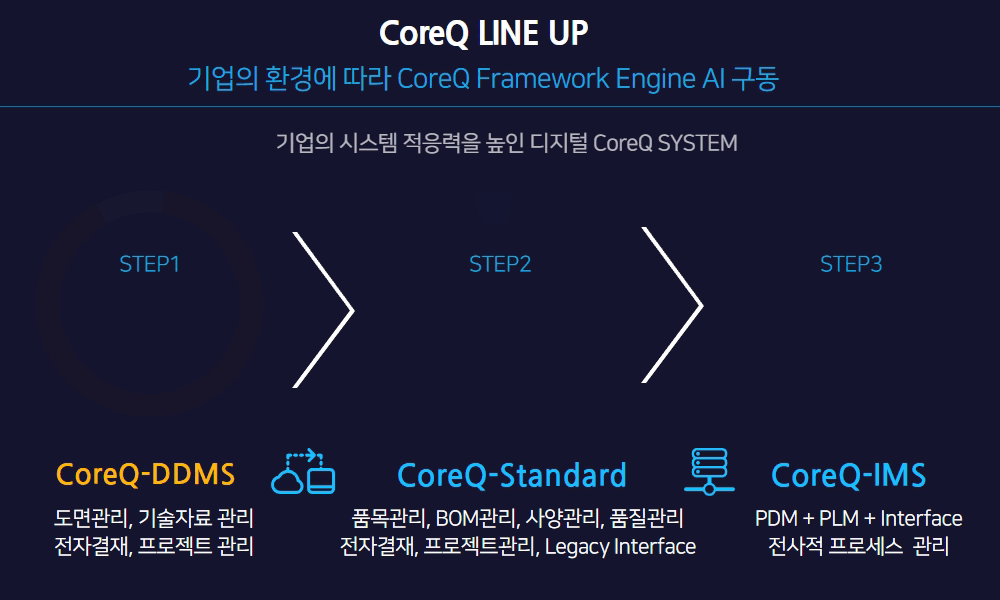 CoreQ Solution ÀÇ ¶óÀξ÷Àº ¾Æ·¡¿Í °°À¸¸ç, °í°´»ç°¡ ÇÊ¿äÇÑ ºÎºÐ¸¸ Àû¿ëÇÏ¿© ±¸Ãà°¡´ÉÇÕ´Ï´Ù. 1. PLM Brand Name : CoreQ PLM 2. CoreQ PLM ÀåÁ¡ 1) ±¹³» ÀÚü °³¹ß ¼Ö·ç¼Ç : Á¦Á¶ÇÁ·Î¼¼½º¿¡ ÃÖÀûÈ / ¶óÀ̼±½º ºñ¿ë Ùí / Æ¯ÈµÈ À¯Áöº¸¼ö 2) ÇÊ¿äÇÑ ¸ðµâ¸¸ Àû¿ëÇÒ ¼ö ÀÖ´Â ¸ðµâÈ ¼Ö·ç¼Ç (°í°´»ç ¼±ÅÃ) : ÆÄÆ®/BOM/¹®¼/µµ¸é/CAD Integration/¼³°èº¯°æ/4M/ÇÁ·ÎÁ§Æ®°ü¸® ¸ðµâ µî 3) Ÿ ½Ã½ºÅÛ°úÀÇ ¿¬µ¿ ¹× ¸ð´ÏÅ͸µ : ERP / SCM / MES / GW ¿ÍÀÇ Á¤È®ÇÑ ¿¬µ¿ ¹× À̽´ ¸ð´ÏÅ͸µ 3. CoreQ Á¦Ç° ¶óÀξ÷ 1) CoreQ DDMS : µµ¸é/¹®¼/ÇÁ·ÎÁ§Æ® [µµ¸é°ü¸®°¡ ÇÊ¿äÇÑ ±â¾÷, ·»Å» ¹× Ŭ¶ó¿ìµå Àû¿ë°¡´É] 2) CoreQ Standard : ÆÄÆ®/BOM/µµ¸é/¹®¼/¼³°èº¯°æ/ÇÁ·ÎÁ§Æ® + ¿¬µ¿ 3) CoreQ IMS : CoreQ Standard + 4M/º¯°æÁ¡/ECR/Àû¿ë½ÃÁ¡ * ¿¬µ¿ ** ¿¬µ¿ : ERP, MES, SCM, Groupware µî CoreQ Solution ÀÇ ¸ðµâº° ¼¼ºÎ ±â´ÉÀº ¾Æ·¡¿Í °°½À´Ï´Ù. - Á¦Ç° / Assembly / ºÎǰ / ¿ø·á °ü¸® . ºÐ·ùü°è Ç¥ÁØÈ, ±Ô°ÝÁ¤º¸ Ç¥ÁØÈ - BOM/Recipe °ü¸® ¡¤ ¸®ºñÀü(ÀÌ·Â)º° µ¥ÀÌÅͰü¸®, ¸ÖƼ ºñ±³ ±â´É(ÃÖ´ë 5°³ Á¦Ç° - ±¹³»À¯ÀÏ) - ±â¼ú¹®¼°ü¸®/µµ¸é°ü¸® ¡¤ ¸ÖƼ ÆÄÀÏ , ÀÌ·Â °ü¸® - ¼³°èº¯°æ°ü¸® . º¯°æ ÀÌ·ÂÃßÀû, ¿ø°¡ º¯µ¿³»¿ª, Á¦Ç° ±¸¼º º¯°æ ÀÌ·Â - ÇÁ·ÎÁ§Æ®°ü¸® ¡¤ ÀÏÁ¤,¸®¼Ò½º,»êÃâ¹°,¾÷¹«ÀýÂ÷,À̽´ °ü¸® - Dashboard / Portal °ü¸® ¡¤ µ¥ÀÌÅÍ¿Í ÇÁ·Î¼¼½º ÇöȲ µµ½ÄÈ